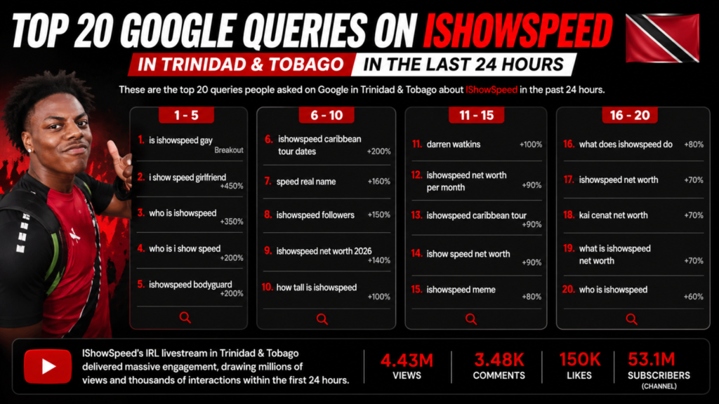 Looking at the top 20 Google queries tied to IShowSpeed in Trinidad & Tobago, the behaviour is very clear.
